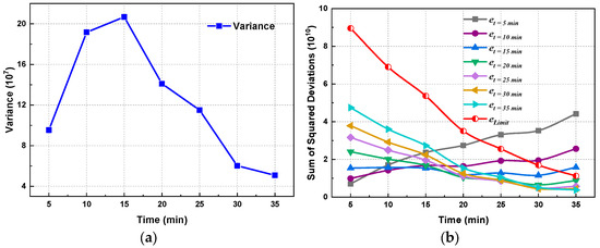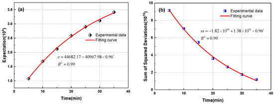Instead, the sum of squared deviations was used; it assesses the degree of dispersion of individual values in a set of data relative to a specific reference value, which is most appropriate for this study. The setting of the reference value is a matter of reflection. Figure 14b shows the distribution of the sum of squared deviations when this reference value is set to the expected greyscale value of the image pixels for different immersion times. The curves of the sum of squared deviations show different, or even opposite, trends (as et = 5 min and et = 10 min) when the expected value for a specific immersion time (t = 5~35 min) is used as a reference value, and when the expected value differs excessively from the pixel greyscale value of the coal sample in its water-filled state. Therefore, as described in Section 3.1, we calculated the limiting expectation value of the image pixel greyscale value (44,334.4) based on the fitted curve of the expectation value of the pixel greyscale value (k < 0.01‰). The trend in the distribution of the sum of squared deviations when using this limit expectation as a reference value (Figure 14b) is clearly a more scientific, valid, and reasonable predictor of the water absorption process in the coal samples.