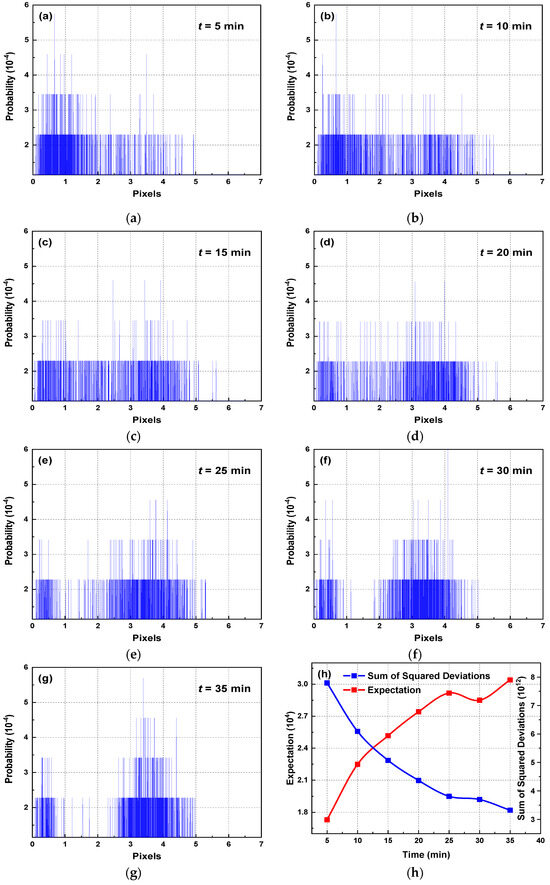 The pixel probability density distributions are shown in Figure 6. Significant differences exist in the distribution of pixel greyscale values in the NMR images of coal samples at different immersion times. When t = 5–15 min, water forms a narrow wet ring only at the outer boundary of the coal samples, and the pixel greyscale values are more densely distributed in the lower part of the range (0–3 × 104) (Figure 6a–c). As the immersion time increases, the dense area of the distribution shifts to the higher part of the range (3–5 × 104), and the probability (≥4.56 × 10−4) of being at these higher levels occurs more frequently (Figure 6f,g). Concurrently, the expected and deviation sum of squares of the pixel greyscale values in the effective region showed overall increasing and decreasing trends, respectively (Figure 6h); this indicated that the overall spatial distribution of water in the coal samples gradually homogenised, in addition to the increase in water saturation per unit area with increasing soaking time, thus further verifying the conclusion above.