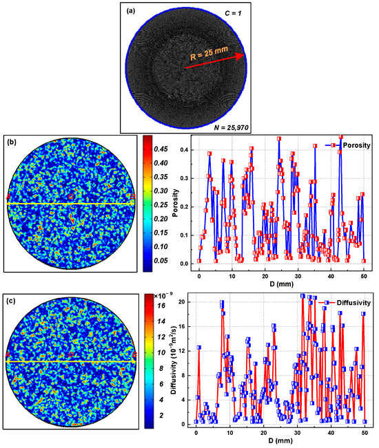 Here, n is the target variable representing the porosity or diffusion coefficient and is the corresponding mean value; and β is the shape factor of the Weber distribution function, representing the degree of concentration of the distribution of the target variable n. Specifically, the larger β is, the more concentrated the distribution around the mean value . Additionally, the generation of unacceptable values was avoided by setting a range () for all random variable values. At this point, the porosity and diffusion coefficients of the model can be considered nonuniform; their distributions are shown in Figure 7b,c. The other material parameters of the model are listed in Table 1. This method of characterising the heterogeneity of coal has been verified across multiple studies [43,44,45].