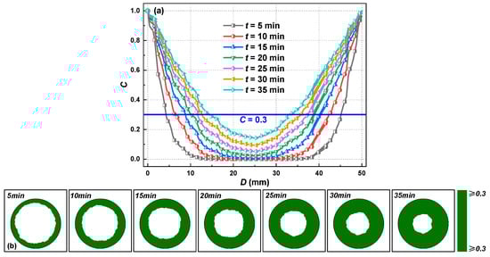 The variation in concentration along the diameter of the sample at different immersion times is shown in Figure 9a. Assuming that the sample was water-bearing when the concentration reached 0.3, it was possible to quantitatively characterise the water diffusion process within the sample. Using C = 0.3 as the concentration boundary, the cross-sectional water distribution of the coal sample was plotted (as shown in Figure 9b). The green area denotes the water content area of the coal sample, and the boundary between the green and white areas is the inner boundary of the wet ring of the coal sample; based on this boundary, the widths of the wet ring of the coal samples were determined to be 4.55 mm, 7.76 mm, 9.26 mm, 11.38 mm, 12.97 mm, and 15.89 mm when the water immersion time t was 5, 10, 15, 20, 25, 30, and 35 min, respectively. With increasing immersion time, the width of the rings gradually increases, extending toward the centre and aligning with the experimental observations illustrated in Figure 10. Meanwhile, the testing accuracy of the width of the wet ring is 0.01 mm, with a testing error of no more than 0.1 mm (i.e., 0.2%). This demonstrates that the model in Section 2.2 and the parameters in Table 1 can effectively describe the diffusion of water in the coal samples.