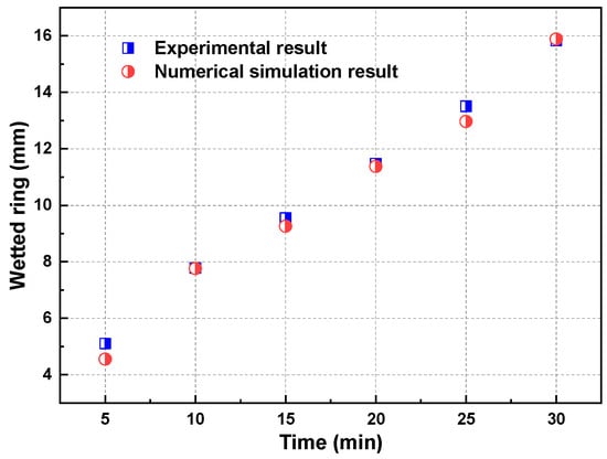 The thermal movements of fluid molecules cause the diffusive movement of the fluid, and the diffusion coefficient is the main physical parameter characterising the diffusion capacity of the fluid. Therefore, the accurate determination of the water diffusion coefficient of a coal sample is vital in ensuring a complete description of the water absorption process. To solve this problem, t = 20 min was chosen as the characteristic time point to analyse the water distribution at different diffusion coefficients, as shown in Figure 11. There are obvious differences in the degree of water absorption with different diffusion coefficients; the larger the diffusion coefficient, the larger the width of the wet ring, and the more concentrated the water-bearing region of the coal sample is towards the centre. The width of the wet rings of the coal samples was measured for different diffusion coefficients and analysed for comparison, as shown in Figure 12. The red dashed line in the graph shows the simulated wet ring width of the coal sample after 20 min of immersion. When D0 ≥ 12.0 × 109 m2/s, the wet ring width reaches 25 mm after 20 min of immersion, which is 100% of the cross-sectional area of the coal sample; when D0 ≤ 0.45 × 109 m2/s, the wet ring width does not exceed 5 mm after 20 min of immersion. A refined comparative analysis was performed after determining the upper and lower boundaries of the diffusion coefficients. The wet ring width is clearly most in accordance with the experimental observations when D0 = 4.5 × 109 m2/s. Therefore, D0 = 4.5 × 109 m2/s is a reasonable diffusion coefficient for this coal sample.