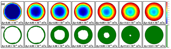 Simulation results of the (a) concentration and (b) wet ring at different diffusion coefficients. Note: The coloured bands in (a) represent the value of the porosity/diffusion coefficient, with brighter colours representing higher porosity/diffusion coefficients. The green colour in (b) indicates regions within the coal sample where C ≥ 0.3.