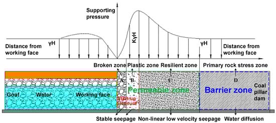 As previously mentioned, this study was conducted within the engineering context of assessing the stability of coal pillar dams in underground reservoirs within coal mines. These coal pillar dams, initially formed as boundary coal pillars left after coal extraction, endure a multitude of challenges. They are not only exposed to long-term erosion and water infiltration but are also subjected to complex loads resulting from the movement and breakage of the roof and the presence of unique geological structures, such as faults during the coal mining process. According to the “Limit Equilibrium Theory” [46] in mining rock mechanics, after the coal pillar dam is left in place, the support pressure above it gradually increases as the distance from the working face increases, and then it gradually decreases after the peak until it returns to the original rock stress level (γH), as shown in Figure 13. The coal pillar dam passes through the broken zone (A), plastic zone (B), resilient zone (C), and primary rock stress zone (D), where the broken and plastic zones are collectively referred to as the limit equilibrium zone. As the distance from the working face decreases, a notable increase in the degree of fragmentation is observed in the coal pillar dam. This fragmentation corresponds to a heightened level of pore development within the dam. In particular, within the broken zone (denoted as “A”), the coal exhibits extensive macroscopic fractures, facilitating the direct flow of water into and through the coal.