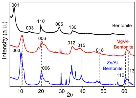 The confirmation of the crystallinity of the obtained LDH composites was established by comparing the diffraction peaks with those of the original bentonite, as shown in the results of the powder XRD studies. Figure 2 shows the diffractograms of the original bentonite B-Na+ and the synthesized Mg/Al-bent and Zn/Al-bent composites. In all cases, the diffraction patterns show typical features of layered structures. The XRD pattern of B-Na+ shows all the reflections of a typical dioctahedral smectite [34]. The appearance of a more intense line at 2θ = 7.16° and two others at 2θ = 19.96° and 2θ = 28.76° indicates that the bentonite is composed mainly of montmorillonite. These XRD patterns correlate well with the standard JCPDS file (card no. 13-0135) [23]. The distance between the layers, known as the basal spacing d001 and calculated from the position of the first basal reflection, was determined to be 12.47 Å.