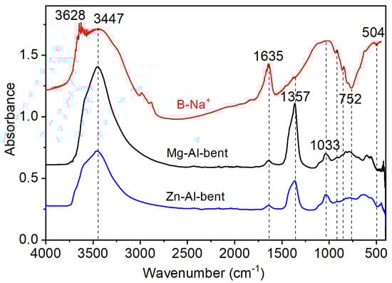 Fourier transform infrared spectroscopy (FTIR) is a spectral technique that captures changes in the vibrational and rotational states of molecular bonds. It provides valuable insights into the presence of absorbed water molecules and structural hydroxyl groups within clay minerals, making it an exceptional tool for discerning the composition of organic compounds and mineral structures. Figure 3 shows the FTIR spectra of different composites, including Mg/Al-bent, Zn/Al-bent, and bentonite (B-Na+) as a reference. The spectra display similar features across all bands. The bentonite spectrum exhibits broad absorption bands that correspond to the characteristic absorption profile of montmorillonite minerals [36]. At 3628 cm−1, an absorption band is attributed to the stretching vibrations of O-H groups (νOH), indicating the presence of hydroxyl groups within the silicate framework linked to octahedral cations (Al-OH-Al). A shoulder is observed around 3447 cm−1, attributed to the stretching vibration of H-O-H in water molecules within the interfoliar space.