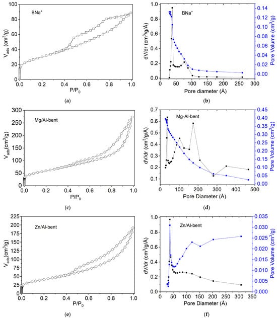 N2 adsorption–desorption isotherms of (a,b) B-Na+, (c,d) Mg/Al-bent, and (e,f) Zn/Al-bent. The corresponding pore size distributions are shown as well for all samples.