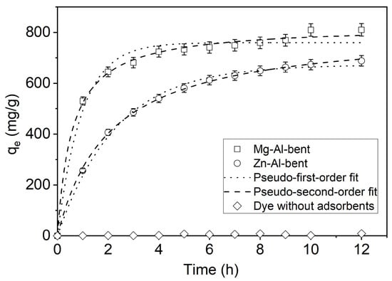 Based on our earlier observations, it appears that the bentonite does not have a significant adsorption capacity for Orange II. The reason for that is the negative charged layers in its structure that cause an electrostatic repulsive effect on the anionic Orange II molecules [46]. However, when modified with LDH, the adsorption of Orange II is significantly enhanced. Figure 6 illustrates the adsorption data of Orange II versus contact time. Experiments were conducted at a constant temperature of 25 °C and pH 7, using an adsorbent dosage of 4 g/L and an initial dye concentration of 3.4 g/L. The plots depict the adsorption of Orange II on Zn/Al-bent and Mg/Al-bent, revealing three distinct phases: instantaneous adsorption in the first hours, progressive equilibrium in the second phase, and a phase of ultimate equilibrium. At first, the composites Mg/Al-bent and Zn/Al-bent had many unoccupied active surface sites. However, over time, the number of available sites decreases. The adsorption of Orange II on Mg/Al-bent is particularly fast, achieving complete adsorption within 3 h with an initial efficiency of 85% of the maximum capacity (724.20 mg/g). Similar rapid kinetics were observed for Orange II on the Zn/Al-bent composite. The dye was fully saturated after 5 h, resulting in a removal rate of 74%, which corresponds to an adsorption capacity of 630.08 mg/g. The control experiments yielded results indicating that the contaminant concentration remained stable regardless of contact time, suggesting a significant lack of adsorption in the absence of LDH composites.