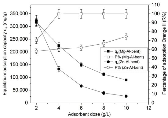 In order to determine the optimal amount of Mg/Al-bent and Zn/Al-bent composites to be added to the dye solution, a series of experiments were conducted using 100 mL of a 1 g/L dye solution, with varying amounts of Mg/Al-bent or Zn/Al-bent introduced. Figure 7 shows the effect of the adsorbent dose on removing Orange II from the aqueous solution.