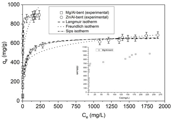 Within the concentration range of 150–4000 mg/L, Zn/Al-bentonite and Mg/Al-bentonite removed 68% and 99% of the dye, respectively. It is noteworthy that Mg/Al-bentonite has not yet reached saturation, indicating the potential for further adsorption. This is hypothesized to be due to the formation of a monolayer on active surface sites, with additional adsorption occurring on the already adsorbed dye, creating new adsorption sites [18]. The adsorption capacity of Orange II on Zn/Al-bent increases with the initial concentration of dye, ultimately reaching saturation. All isotherms are H-shaped according to the Giles et al. classification, indicating high adsorbate affinity for the adsorbent, resulting in near-complete adsorption in dilute solutions [54]. Following the initial steep rise, the isotherm plateaus, signifying the attainment of adsorption equilibrium. At equilibrium concentration, the dye adsorption on Zn/Al-bent and Mg/Al-bent reaches 650.34 and 892.03 mg/g, respectively. The micropore structure and surface area primarily determine the affinity of Zn/Al-bent and Mg/Al-bent for organic compounds. Mg/Al-bent has a larger SBET of 209.25 m2/g and Vp of 0.423 cm3/g compared to Zn/Al-bent (SBET = 175.95 m2/g and Vp = 0.313 cm3/g), while the layered structures follow the same order.