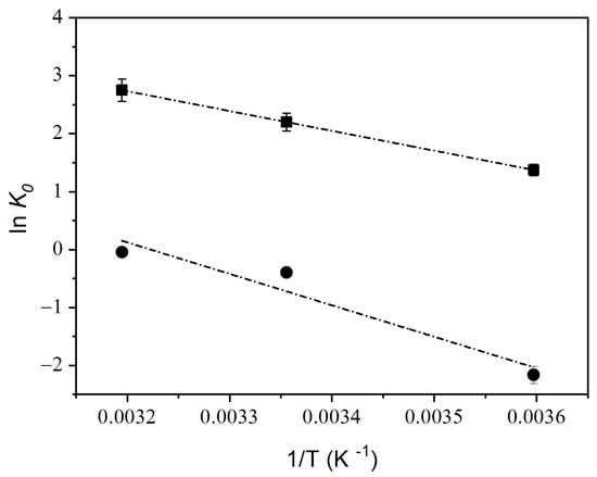 Plots of ln K0 versus reciprocal temperature were used to evaluate the thermodynamic parameters of Orange II removal on Mg/Al-bent (filled squares) and Zn/Al-bent (filled circles), applying the following experimental conditions: adsorbent concentration = 0.1 g/25 mL; contact time t = 6 h; and pH = 7.
