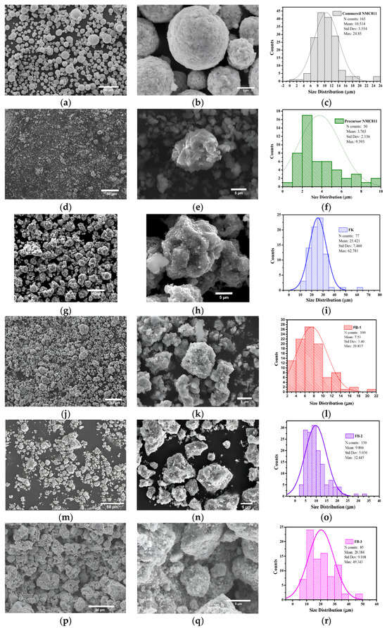 Morphology analysis of NMC-811 cathode material. (a–c) SEM images at 500× and 2500× magnification and particle-size distribution of commercial NMC811. (d–f) SEM images at 500× and 2500× and particle-size distribution of NMC–oxalate precursor. (g–i) SEM images at 500× and 2500× and particle-size distribution of NMC-811 produced with small furnace (FK). (j–l) SEM images at 500× and 2500× and particle-size distribution of NMC-811 produced with large furnace with process condition 1 (FB-1). (m–o) SEM images at 500× and 2500× and particle-size distribution of NMC 811 FB with process condition 2 (FB-2). (p–r) SEM images at 500× and 2500× and particle-size distribution of NMC-811 FB with process condition 3 (FB-3).