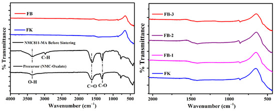 FTIR was applied to investigate the surface chemical composition of the NMC-811–oxalate precursor and the active material NMC-811 before and after the sintering stage, as shown in Figure 2. Before sintering, the NMC–oxalate precursor and the NMC-811 MA displayed significant peaks at 3346 cm−1, 1611 cm−1, and 1312 cm−1, which, respectively, represented O-H, C=O, and C-O bonds from the carboxyl functional group of oxalic acid. The oxidation process was successfully achieved in both the FK and FB materials after the sintering process, as indicated by the disappearance of organic functional groups in the FTIR spectra of both materials. C-O bond peaks vanished at about 1400–1300 cm−1 for the FK and FB materials because of the dissociation of carboxyl in the heating process and the release of CO2 gas.