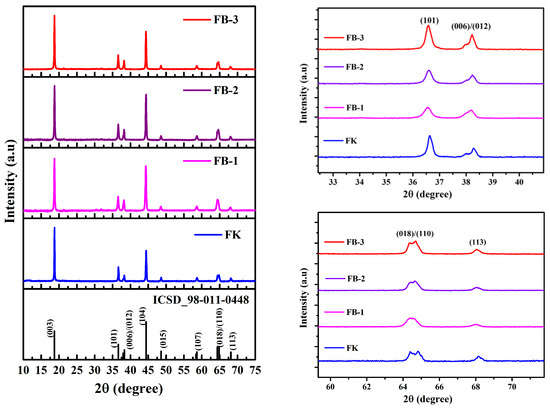 XRD characterization was performed to determine the crystalline structures of NMC-811. Figure 3 presents the XRD patterns of the FK and FB samples. The XRD experimental data were compared to the Joint Committee on Powder Diffraction Standards (JCPDS) reference pattern No. 98-001-0448 using Highs Core Plus Software. The analysis identified that the diffraction pattern was compatible with the JCPDS No. 98-001-0448 of NMC. All peaks were indexed on the basis of the hexagonal a-NaFeO2 structure with the R3m space group [2]. The well-ordered, layered material could be assessed utilizing the lattice parameter and the I ratio presented in Table 2. The substantiation of the layered configuration was established using the c/a ratio of the lattice parameter, which served as a direct indicator of the lattice’s deviation from a perfect cubic close-packed lattice. An ideal close-packed lattice is characterized by a c/a value of 4.899 [4]. Notably, the observed c/a ratios in all our samples surpassed 4.900, affirming the presence of a well-organized layered structure. However, the doublet peaks for the (006)/(102) reflections at 37° (2θ) and the (018)/(110) reflections at 65° (2θ) were also indicative of the presence of ordered hexagonal layered structures [3]. The doublet peaks were obviously observed in FK and FB-3, while FB-1 and FB-2 did not show distinct splitting for the (006)/(102) and (018)/(110) reflections. This clearly confirmed that the longer heating time and the higher gas flow for the cathode material production with FB favored the formation of the well-ordered layered structure necessary for the efficient intercalation/deintercalation of lithium ions during battery charge–discharge cycles. This was evidenced by the clear peak splitting of the (006)/(102) and (018)/(110) reflections. Furthermore, the potential for cation mixing arose from introducing a small quantity of Ni2+ at the Li+ site. This mixing occurred because of the presence of Ni2+ during phase formation, detrimentally affecting the performance of the NMC cathode material. Replacing Li+ with Ni2+ obstructed the Li-ion pathway, leading to suboptimal electrochemical performance. It is noteworthy that a higher value of I(003)/I(104) corresponded to reduced cation mixing in the material [22]. The ideal value of I(003)/I(104) is >1.2. Table 2 indicates that the I(003)/I(104) ratio value was greater than 1.2 for all samples, signifying a low degree of cation mixing.