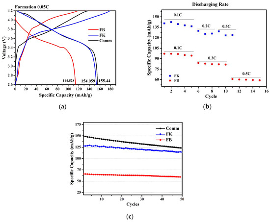 The electrochemical performance test aimed to analyze the capabilities of the cathode material when fabricated in the form of a full-cell battery with a graphite anode. Graphite is an anode material that is widely used and is commonly used in the LIB industry. There are several alternative anode material choices, such as Hard Carbon [25]. However, due to its cheap price and fairly good performance when combined with LIB cathodes, in this experiment, graphite material was chosen as the anode. Electrochemical tests were carried out using cylindrical cell type 18650. The cylindrical type was chosen. It has good mechanical stability because it uses stainless steel for the outer case [26] and has wide applications for stationary energy-storage systems and moving vehicles such as e-bikes, e-motorcycles, and electric cars [26]. The produced NMC-811 cathode samples were evaluated for capacity based on commercial materials in this test. Figure 5a displays the battery capacity testing (discharge) results in the first cycle formation process with a current of 0.05 C. The commercial material showed a specific capacity result of 155 mA·h/g, and the produced cathode material showed specific capacity results of 115 mA·h/g (FB) and 154 mA·h/g (FK). The battery cell with the best performance-specific charge–discharge capacity was the one with NMC-811 synthesized in a small muffle furnace (FK) rather than FB. Based on the active material characterization, the crystallinity of NMC-811 in FK is superior to that in FB.