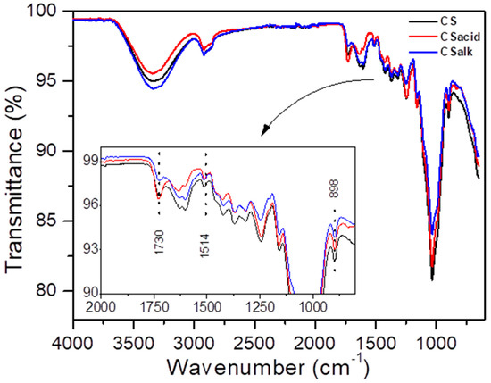 Infrared spectra of the corn straw fibers (nature, acid, or alkaline) showed characteristic absorption signals for lignin and cellulose structures, as shown in Figure 1. Lignin is confirmed by the absorption signal at 1730 cm−1, corresponding to C=O carboxyl vibrational stretches [24,25]. In acid treatment processes, the metal ions chemically linked to the carboxyl groups of the biomass are mostly removed, which results in a slight increase in absorbance in this region, relating the carboxyl groups of the uronic acid in the hemicellulose of the pre-treated samples [26]. While the peak at 1514 cm−1 is the stretching vibration of the C=C aromatic ring that corresponds to cellulose and lignin, in the alkalization process, the signal intensifies slightly due to the presence of water absorbed by the cellulose [10,24]. Another band-typical structure of cellulose is evidenced at 898 cm−1, which was due to the β-glycosidic bond of the glucose ring, where this sign indicates that the pre-treatments did not completely remove cellulose and sugars present in the straw [12,25].