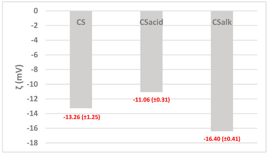 This difference is because the surface has an electrically negative charge and a greater interaction is created for positively charged adsorbates, because of the presence of OH− ions when treated in an alkaline medium [10,16]. On the other hand, the test using anionic adsorbate was less effective, created by the electrostatic repulsion of the surface of the adsorbent and the CR, but showed some efficiency in the percentage of removal [16]. According to the ratio of the amount removed between the dyes, there is indeed a greater affinity for cationic dyes, but this does not rule out the effectiveness of removing anionic dyes, caused by electrostatic interactions, and the selectivity of the dye was consistent with the zeta potential presented by the samples. The sample with the most negative potential value, CSalk (−16.40 mV), showed better removal for the cationic dye MB, while the sample with the lowest potential value, CSacid (−11.06 mV), was the one that showed better removal for the anionic dye, Congo red.