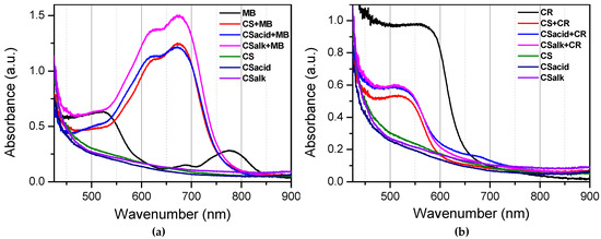 Figure 4 shows the diffuse spectra of the initial corn straw samples, and those pigmented with the dyes methylene blue (Figure 4a) and Congo red (Figure 4b), in absorbance mode. The absorption spectrum of methylene blue is characterized by intense bands in the 640–850 nm region, it is composed of two maxims at 687 nm and 779 nm. The high peak at 779 nm shows a high quantity of monomers compared to the peak at 687 nm, which suggests a low quantity of dimers. This is due to the high degree of molecular electronic conjugation where hydrophobic interactions occur between the dye rings [38,39,40]. When MB is adsorbed onto corn straw, the displacement and widening of the bands to the 500–800 nm region indicate the intensification of intermolecular interactions and the electronic coupling of interaction with the straw surface, while also preserving the dye’s characteristic color tone [39].