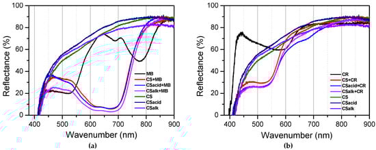 Preference is given to protonation of the primary amines of Congo red molecules in solution, rather than those attached to the CSacid surface [44]. This is different for CSalk+MB, as there was no significant variation in colors, except in sodium bicarbonate medium, increasing brightness (L*), as shown in Table 3. This factor may be attributed to the fact that sodium bicarbonate can act as a bleaching agent for the fiber, also influencing the lesser loss of color in the case of Congo red [45,46]. It is possible that the greater discoloration of the Congo red dye compared to methylene blue was a result of the surface charge of the fibers, which presented a negative charge and therefore, greater affinity for the cationic dye MB and, consequently, the anionic dye CR would be desorbed more easily.