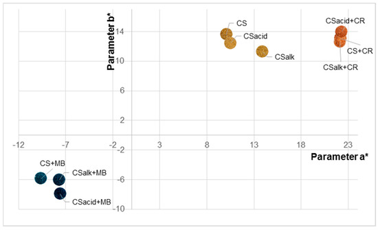 It is possible to observe a visual change in the color of the samples after the dye removal process. When a graph is plotted as a function of the parameters a* (where negative refers to green and positive to red) and b* (where negative refers to blue and positive to yellow) (Figure 6), it is observed that in comparison with natural fibers, when the methylene blue dye is adsorbed, the colorimetric resultant moves towards the negative direction of both a* and b*, while when the Congo red dye is adsorbed, the colorimetric resultant moves only towards to the positive axis of a*, for redder tones.