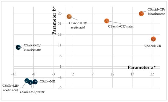 Relationship between the colorimetric parameters a* and b* in the coloring corn straw samples after desorption with methylene blue and Congo red.