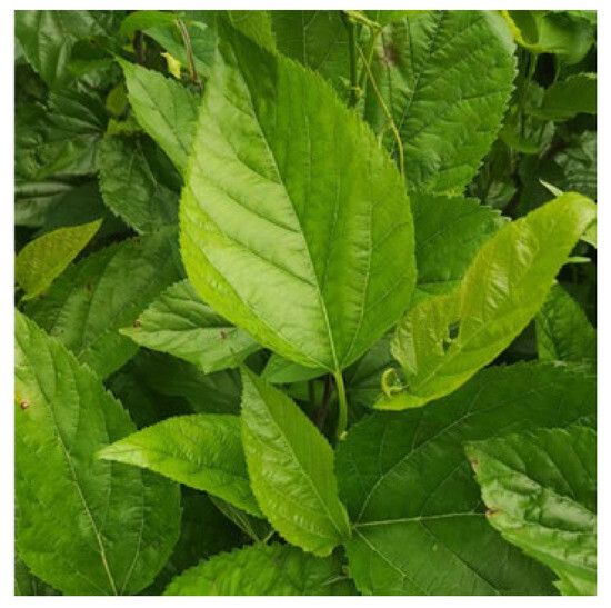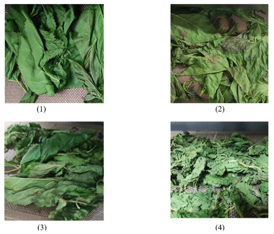 Mulberry leaves are rich in nutrients and natural bioactive substances [1], which can significantly inhibit “three highs” and enhance the body’s immunity and other functions [2,3]. Fresh mulberry leaves are shown in Figure 1. Mulberry leaf tea production involves a series of processes, including picking, fixing, kneading, drying, packaging, storage, and other steps [4]. Among these, fixation is the most crucial process in the production of mulberry leaf tea [5]. To achieve a higher organoleptic quality, mulberry leaves are subjected to fixation at temperatures ranging from 230 °C to 270 °C, a process that plays a decisive role in determining the overall quality of mulberry leaf tea. Fixation mainly involves the inactivation of polyphenol oxidase under high-temperature conditions to prevent the oxidation reaction of polyphenols and to avoid the development of a red color in the mulberry leaves due to oxidation [6,7,8]. Additionally, during this process, the water in the mulberry leaves evaporates, making them soft and preparing them for the subsequent production of mulberry tea.