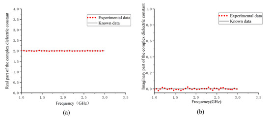 After calibrating the measurement system, we conducted measurements on air, deionized water, and PTFE. We compared the obtained data with known values and verified the results for accuracy before performing measurements on real samples. Figure 4 illustrates the real and imaginary parts of the complex permittivity of PTFE in the frequency range of 2 GHz to 3 GHz after calibration of the experimental equipment at room temperature, compared with the known real and imaginary parts of the complex permittivity of PTFE at room temperature. The comparison results demonstrate the high accuracy of the measurement system.