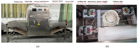 Physical system of continuous microwave fixer for mulberry leaf tea. (a) Continuous microwave mulberry leaf tea fixing machine; (b) Part of the power supply and cooling fan.