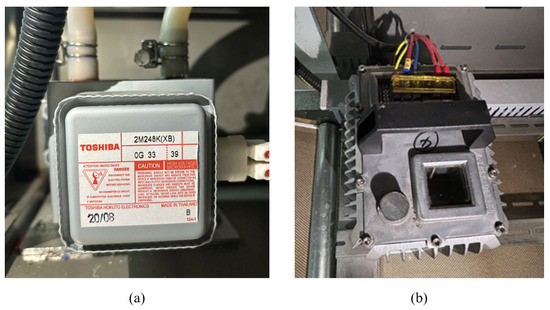 Magnetrons, being the most economical microwave generators, have found extensive applications in various industrial microwave equipment. For this study, the Toshiba magnetron 2M248K (XB) was chosen as the microwave source primarily due to its affordability, stable performance, ease of control, and compatibility with conventional equipment. This kind of magnetron, which is widely used in industrial processes, such as microwave drying, sterilization, and medical production, can provide an output power of 1050 W at a frequency of 2450 MHz. On the other hand, the stability and performance of the magnetron are directly affected by the magnetron power supply, which is a power module that provides the magnetron with the appropriate voltage and current to enable its normal operation. There are two main types of magnetron power supply: oil-cooled power supply and air-cooled power supply. Compared with the air-cooled power supply, the oil-cooled power supply has obvious advantages, such as good heat dissipation, high output power, and good insulation. Therefore, considering the long fixed working time of mulberry leaf tea production, an oil-cooled magnetron power supply was used in this study to ensure the stability of the magnetron of the continuous microwave mulberry leaf tea fixing machine. The magnetron and its power supply are shown in Figure 8a,b, respectively.