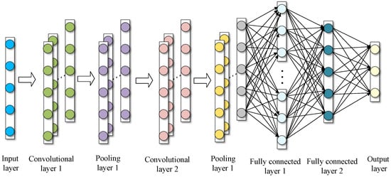 The 1DCNN possesses two important characteristics: local connectivity and weight sharing. Local connectivity enables automatic learning and extraction of local features from data, allowing for the neural network to handle large-scale data and improve computational efficiency. Weight sharing significantly reduces the number of parameters that need to be learned in the diagnostic model, thereby enhancing training efficiency and generalization capability. This enables the diagnostic model to handle various types of complex data. The basic structure of a 1DCNN is illustrated in Figure 1, consisting primarily of an input layer, convolutional layers, pooling layers, fully connected layers, and an output layer [28,29].