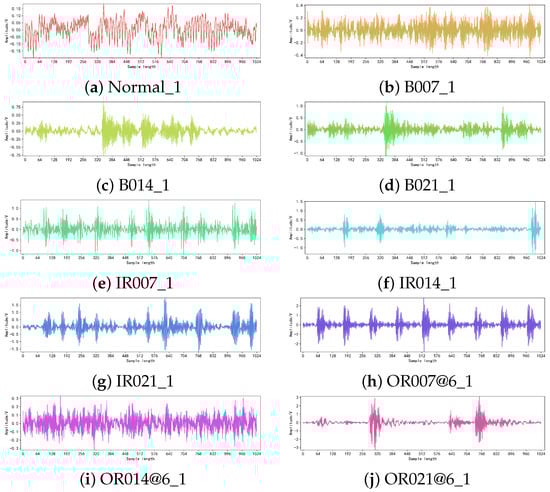This study utilizes the publicly available bearing dataset provided by Case Western Reserve University (CWRU) [33] as the research subject. This dataset simulates various types and degrees of bearing faults, collecting a large amount of vibration signal data from sensors. The specific experimental bearing equipment is shown in Figure 3. The drive end fault data were selected from a deep groove ball bearing model 6205-2RS JEM SKF. The sampling frequency was set to 12 kHz, the motor load was 1 horsepower (HP), and the motor speed was approximately 1722 rpm. The vibration data were collected using accelerometer sensors connected to the magnetic base attached to the housing, while the speed and motor load in horsepower were measured by torque sensors and encoders, respectively. Bearing faults were machined using electrical discharge machining and classified into three damage diameters: 0.007 inches, 0.014 inches, and 0.021 inches. Four types of data were selected, representing inner race faults, outer race faults, roller faults, and normal operation of the bearings. The samples were divided into equal intervals, with cutting lengths of 1004, 1014, 1024, and 1034, resulting in four different sampling lengths for the original dataset. The specific details of the bearing original dataset are shown in Table 1, and the corresponding curves for 10 different operating conditions are shown in Figure 4.