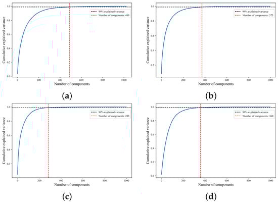 The number of principal components corresponding to a cumulative variance explained ratio [34] higher than 99% is chosen as the final dimensionality reduction in PCA. Specifically, in Figure 5a–d, respectively, the curves between the number of principal components and the variance contribution rate obtained by PCA analysis for four sample lengths are represented: 1024, 1004, 1014, and 1034. In Figure 5a–d, it can be observed that the numbers of principal components reaching an over 99% variance contribution rate initially are 489, 373, 283, and 360, respectively. This paper selects the maximum number of principal components as the final dimensionality reduction dimension for all samples.