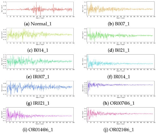 After dimensionality reduction using PCA on the normalized bearing dataset, the sample length of all 10 bearing states becomes 489. The corresponding curve shape after dimensionality reduction is shown in Figure 6. By adaptively selecting sample lengths when they are uneven, it is possible to increase the model’s generalization ability and improve the training efficiency of the model in complex situations. Furthermore, this allows for the extraction and learning of key fault information, ultimately enhancing the diagnostic accuracy of the model.