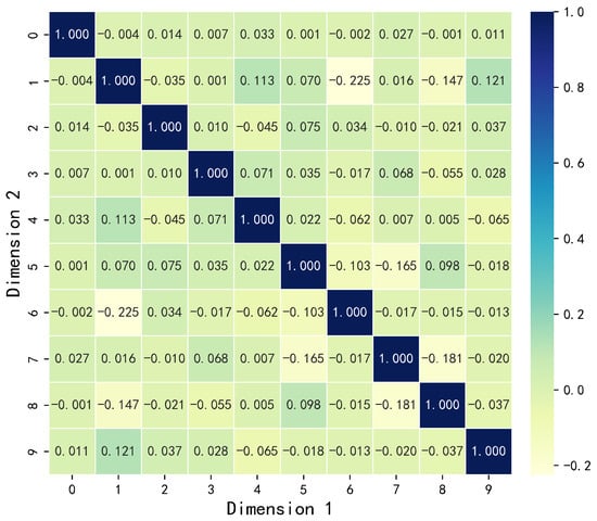 In this section, we calculate the Pearson correlation coefficients [35] between the 10 bearing states to obtain similarity information, enabling an intuitive analysis of the correlation between the states after dimensionality reduction. The resulting Pearson correlation coefficient matrix is presented in Figure 7.