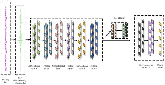 In the algorithm model constructed in this paper, the PCA-adapted dimensionality-reduced bearing signals are used as the input to optimize the model’s performance and accelerate its convergence speed. In the model, the number of convolution kernels in the convolutional and pooling layers doubles layer by layer. Multiple one-dimensional convolutional kernels can learn features of different scales, while pooling operations reduce data dimensions and parameters. Multiple convolution–pooling combination layers gradually enlarge the receptive field, learning local features over broader ranges in the bearing signals, thereby extracting more advanced and abstract features. The SeNet layer has a feature compression ratio set to 16. It employs an attention mechanism, enabling adaptive learning of the importance of each channel and dynamically adjusting feature weights to enhance the model’s focus on key features, further exploring important fault features. Two fully connected layers process the feature output by the SeNet layer, helping the model capture complex correlations between various local features and perform feature combination and classification through weight matrices. The output layer is a Softmax layer, ultimately outputting a probability distribution vector for each category.