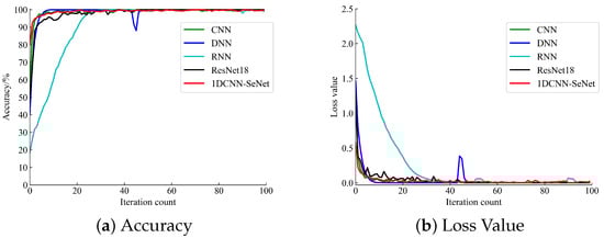 In order to validate the effectiveness and superiority of the proposed model algorithm in this paper, we conducted comparative experiments with four classical algorithms: CNN [36], DNN [37], RNN [38], and ResNet18 [39]. We fed the 6000 samples from the training set into each model for feature learning. By observing the change curves of accuracy and loss values during training, as shown in Figure 9, it can be seen that around 50 iterations, the curves of accuracy and loss values tend to stabilize, indicating that the five models are basically in a convergent state at this point. This result helps to illustrate the performance of each model during training and provides important references for evaluating their performance.
