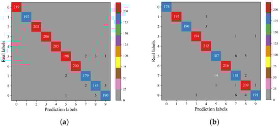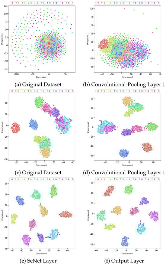 From Figure 11, it can be observed that the 10 categories of the original dataset are in a complex and intertwined state, making it difficult to distinguish each category. After the first convolution–pooling layer, samples from each category in the original dataset start to converge together and exhibit a certain degree of differentiation. After two convolution–pooling layers, samples corresponding to each category further cluster together, showing a clear distinction, but there are still some overlapping phenomena between categories. After the SeNet layer, the differentiation between the 10 categories is further enhanced, making them more clearly distinguishable. Finally, after the output layer, the 10 categories can be basically distinguished, forming distinct clusters in the feature space.