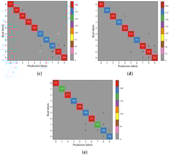 This paper introduces confusion matrices to evaluate the performance of the five fault diagnosis models, demonstrating the correspondence between predicted results and actual situations in each category. The confusion matrices of the five diagnostic models are shown in Figure 10. In these confusion matrices, each row represents the true category, each column represents the diagnostic category predicted by the model, and the numerical values in each cell indicate the number of samples that actually belong to the row category but are predicted as the column category. The intuitive display of confusion matrices allows for us to gain a clearer understanding of the performance of the diagnostic models in each category. By comparing the five confusion matrix graphs, it can be observed that the 1DCNN-SeNet fault diagnosis model constructed in this paper has the fewest misclassifications, demonstrating the superiority and effectiveness of the proposed method.