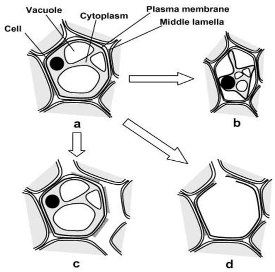 Changes to plant microstructure during dehydration. (a) Fresh cell, (b) shrinkage and plasmolysis, (c) cell-to-cell debonding and (d) cell rupture and cavity formation [].