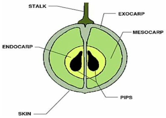 Thompson seedless grapes were used as the material for the experimentation. The internal structure of the grape is separated into fleshy tissue, skin, stalk and seeds []. The focus of this investigation was the internal flesh of the grape, and thus the skin, stalk, endocarp and pips were not important features. The skin (epicarp) is comprised of one layer of epidermis and three of four layers of subepidemic collenchymatous (exocarp). After these layers, the pulp (mesocarp) begins []. This is evident in the images of grapes produced using a light microscope, in which the epicarp and mesocarp layers can be identified (Figure 4).