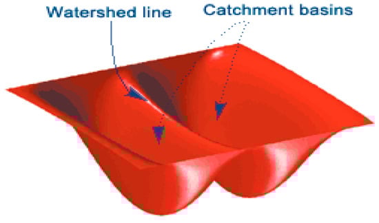 The first technique used to model the cell boundaries in the SEM images was segmentation using the watershed function. The watershed function utilises the behaviour of water catchments in nature, which shows that a basin will drain water into the lowest/deepest point []. Figure 5 shows how catchment basins are formed around large depths and that watershed or ridge lines appear on the boundaries of these catchments.
