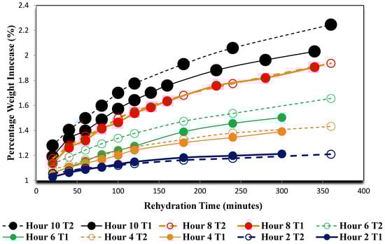 The rehydration data shown in Figure 7 further demonstrate that there is a microstructural difference between the higher temperature grape samples and the lower temperature ones as grapes dried for the same duration at Temperature 1 (70 °C) almost always gained in weight percentage while submerged in the water bath at a slower rate than at Temperature 2 (55 °C).