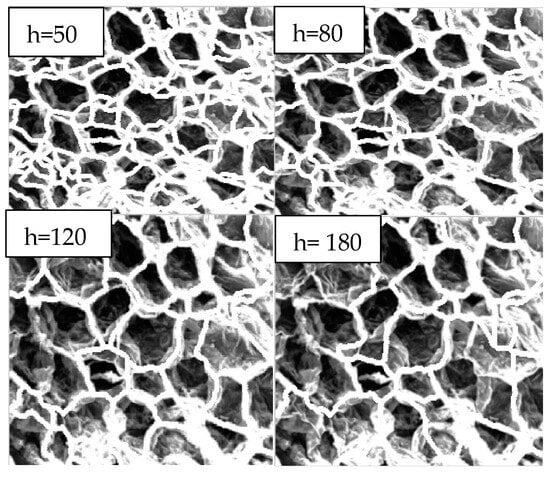 Watershed segmentation at various thresholds (h) for 70 °C, 10_400. Chosen threshold h = 120.