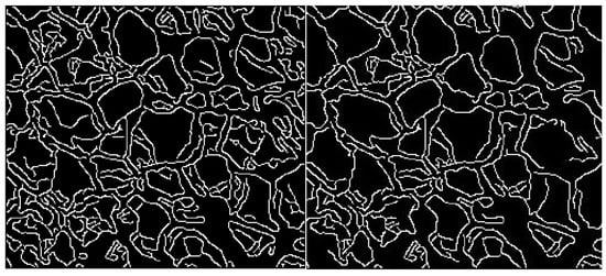 A similar investigation analysing SEM images which showed the microstructural changes of potatoes during drying employed image processing methods similar to this project [,]. This analysis utilised MATLAB algorithms to detect the edge of cells in a potato and measure the cell wall perimeter and area. The process initially detected cell boundaries by using the Canny’s edge detector algorithm, which specified two thresholds for analysis []. Pixels identified beneath the lower threshold were set to appear black and those above the upper threshold white. Pixels which sat between the two thresholds were set to white if they had a neighbouring pixel above this threshold, or black if they did not []. Morphological closing was performed which linked previously detected edges that were close to touching to create an enclosed cell []. The use of a thinning algorithm developed by [] transformed these thick outlines and reduced the solid boundaries into one-pixel-wide outlines []. Pruning was also employed to remove small branches of the cell boundary that did not fully separate cells []. Furthermore, small regions within the image were removed by imposing a minimum number of connected pixels required of shapes (Figure 2).