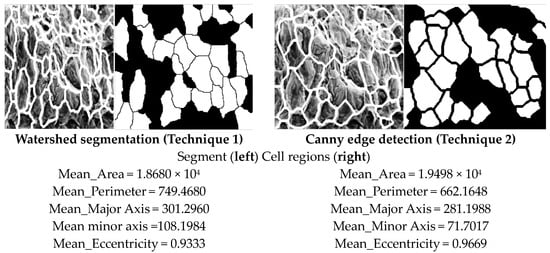 Images were processed using the MATLAB algorithm previously developed to obtain quantitative values for mean area, perimeter, mean maximum and minimum axis length and a value of eccentricity. Two techniques for obtaining these values were used, where Technique 1 utilised the watershed segmentation method, as shown in Figure 9, for different thresholds for 70 °C with a magnification of ×400; Technique 2 used Canny edge detection with several trials to ensure the selection of the best threshold values. Figure 10 shows some of the results altering the thresholds using Canny algorithms and the selected final algorithm for further morphological transformations. Each sample was analysed individually, and the algorithm was altered slightly to negate the effect of over-segmentation (by removing areas that were below a minimum threshold) and to remove most of the cells which were combined and cut off on the edge of the image (by removing cells with a perimeter over the set threshold). Figure 11 shows the cell regions superimposed onto each SEM image by two methods: the thresholds used and the resulting cells, which were analysed to obtain the morphological properties.
