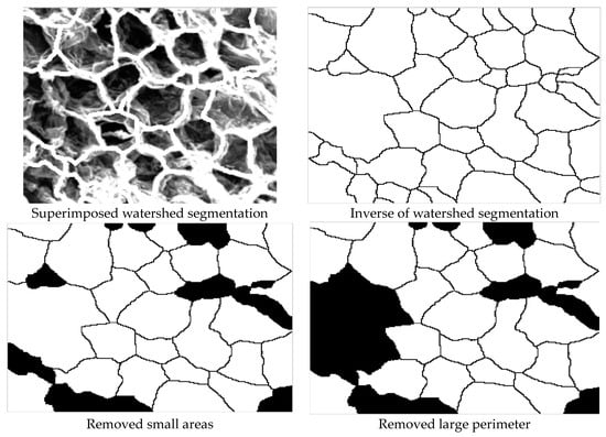 Cell boundaries obtained by Techniques 1 and 2 were used to quantify the microstructure of the images. Before the calculation of the properties, it was necessary to invert the segmented or boundary images. Figure 13 shows the cell detection process for microstructural analysis.