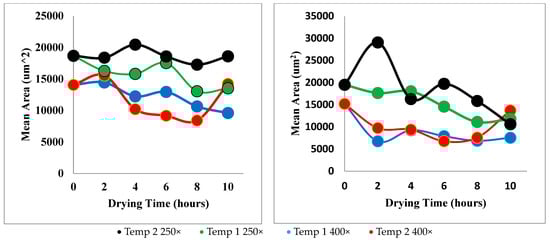 The data obtained from the image analysis for the perimeter was not very successful. It was clear that, on average, for both techniques used to analyse the images, the perimeter decreased with drying time. However, there does not seem to be any clear trend that the perimeter measurements for the Temperature 1 samples were on average less than those for the Temperature 2 samples, which was an expected outcome. In contrast to the other measured parameters, Technique 2 seemed better at modelling these relationships; both 400× magnification data followed similar trends, and both magnification levels of the Temperature 1 data seem to be aligned.