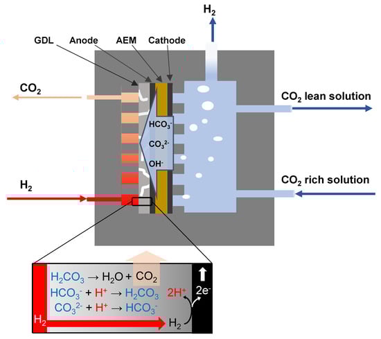 Additionally, oxygen formation is a kinetically sluggish reaction that often demands significantly higher voltage compared to the thermodynamic minimum voltage at a given current density [33]. Therefore, it is necessary to improve the energetic performance of the electrochemical CO2 capture technique in order to make it competitive and practical. Recently, Muroyama et al. [34] developed an electrochemical hybrid cell powered by H2 cycling from the cathode to the anode to generate a pH gradient for CO2 capture from a wide range of gas mixtures. Their approach takes advantage of replacing the oxygen evolution reaction (OER) at the anode with the spontaneous hydrogen oxidation reaction (HOR).