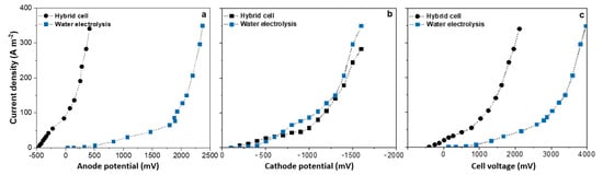 The use of cathodic H2 as an anodic electron donor is thermodynamically more favourable than the use of water leading to oxygen production. At the same time, cathodic H2 represents a practical energy source (e.g., in fuel cells). To investigate the practical benefits of sacrificing cathodic H2 and reusing it as an anodic electron donor, the current–voltage polarisation curves of the described hybrid electrochemical cell were compared with that of an alkaline water electrolyser.