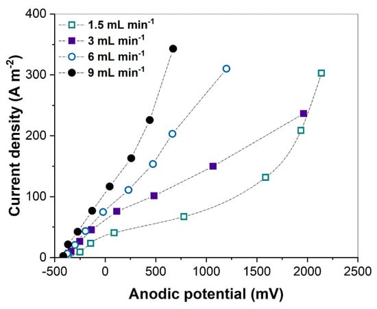 Anodic polarisation curve obtained at different H2 inflow rates into the anode chamber.