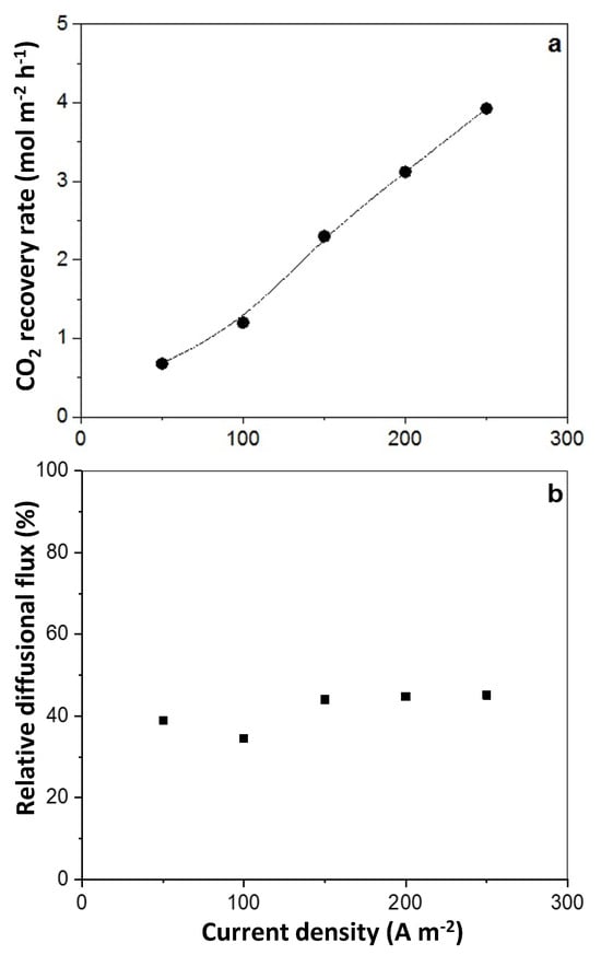 The CO2 recovery rate from the permeate side (a) and relative diffusional flux, (b) as a function of the applied current density.